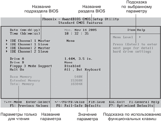 Все разделы BIOS Setup имеют одинаковую структуру (рис. 3.3).