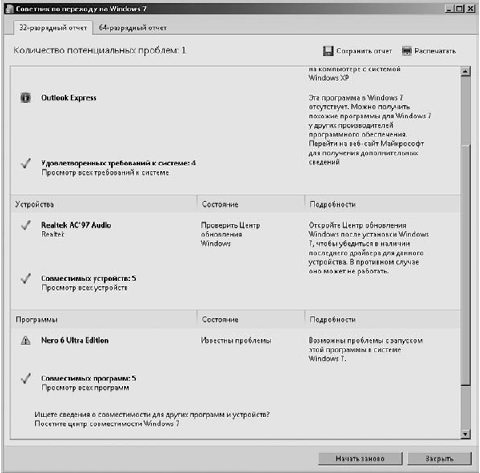 4. В полученном отчете, в разделе Система, можно пройти по ссылке Просмотр всех требований к системе. Здесь вы сможете увидеть информацию о том, какие программы имеют проблемы совместимости с новой операционной системой или не будут поддерживаться, а также драйверы каких компонентов следует обновить (рис. 1.2).