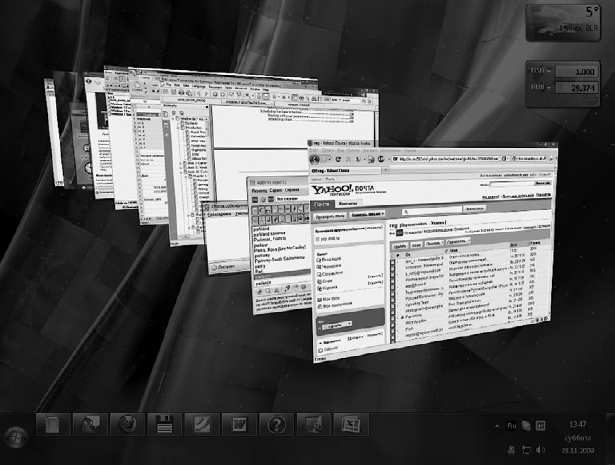 Эффект эргономичного пролистывания стал своего рода визитной карточкой как Windows Vista, так и новой, седьмой операционной системы (рис. 2.3). Теперь у вас есть возможность получить такую же картинку на собственном мониторе. Эргономичное пролистывание призвано обеспечить удобство переключения между большим количеством открытых окон, поскольку сориентироваться в крупных эскизах гораздо проще, чем в многочисленных кнопках панели инструментов. Чтобы выполнить пролистывание, нажмите сочетание клавиш Windows+Tab. В результате на Рабочем столе появятся трехмерные эскизы открытых окон, так, как это показано на рис. 2.3. Продолжая удерживать клавишу Windows, нажимайте Tab или прокручивайте колесико мыши для пролистывания эскизов. Когда нужный образец переместится на передний план, отпустите клавишу Windows. В результате эскиз переместится в плоскость экрана и развернется в окно. Чтобы выполнять пролистывание без удержания клавиши Windows, нажмите сочетание клавиш Ctrl+Windows+Tab.