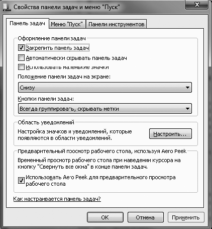 Некоторые параметры Панели задач можно изменить. Для этого щелкните на ней правой кнопкой мыши и в контекстном меню выберите команду Свойства. Откроется окно (рис. 2.22).