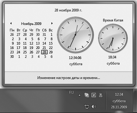 Щелкните на часах в области уведомлений. В результате откроется панель, которая содержит часы и календарь текущего месяца. Можно также настроить отображение дополнительных часов (рис. 2.25).