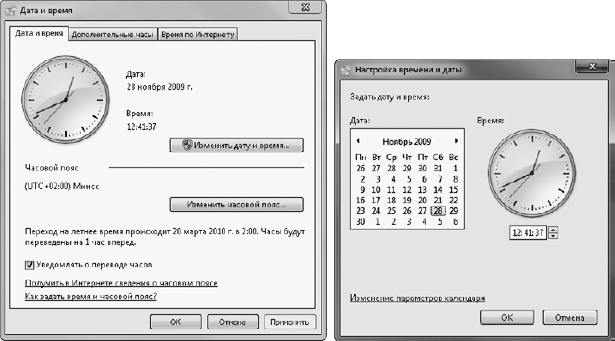 Часовой пояс, дату и время можно указать как при установке Windows, так и в специальном окне, которое открывается щелчком на ссылке Изменение настроек даты и времени (рис. 2.26, слева). Кнопка Изменить дату и время позволяет задать в числовом поле точное время, а для изменения месяца служат стрелки, расположенные слева или справа от названия месяца (рис. 2.26, справа). Чтобы изменить год, необходимо дважды щелкнуть на текущем значении года. Для изменения часового пояса обратитесь к кнопке Изменить часовой пояс и в появившемся окне из раскрывающегося списка выберите нужный регион.