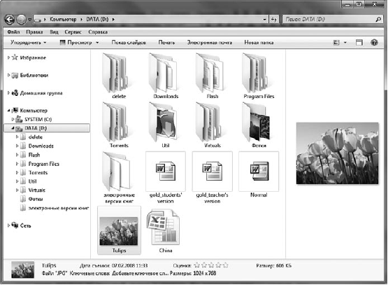 • Область предпросмотра. По умолчанию скрыта. Для ее визуализации нажмите на панели инструментов кнопку Упорядочить и выполните команду Представление ? Область предпросмотра или нажмите кнопку Показать область предварительного просмотра