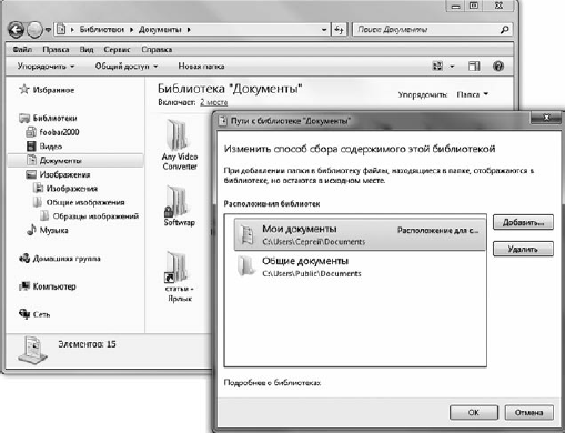 Для просмотра или изменения папки, которая будет являться источником данных для соответствующей библиотеки, нужно щелкнуть на ссылке в области заголовка окна библиотеки напротив Включает. В результате откроется окно (рис. 3.3).