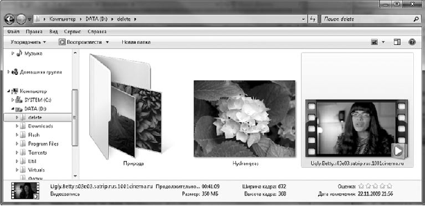 • Огромные значки. В этом режиме отображения значки имеют самый большой размер. Изображения представлены в виде эскизов, видеофайлы – в виде эскизов первого кадра, на значках папок с вложенными файлами можно видеть эскизы файлов (рис. 3.7).