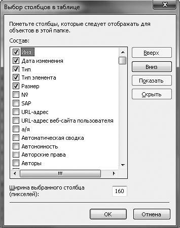 • Таблица. В режиме таблицы наряду с мелкими значками объектов, расположенных, как и в случае списка, по алфавиту, в столбцах выводится информация о каждом объекте: размер, тип файла, дата последних изменений (рис. 3.8). Столбцы для отображения Windows выбирает автоматически, в зависимости от типа объектов, находящихся в папке. Однако при необходимости вы можете самостоятельно задать набор столбцов. Для этого щелкните правой кнопкой мыши на заголовке любого столбца и выберите команду Подробнее. В открывшемся окне (рис. 3.9) установите флажки возле названий нужных столбцов и снимите возле тех, которые вас не интересуют.