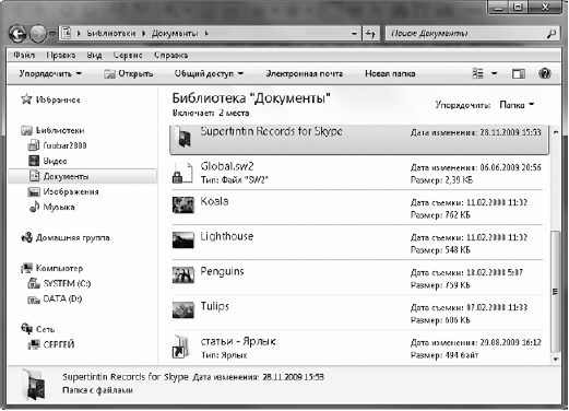 • Содержимое. Этот вид представления объектов папок сочетает в себе средние размеры режима Плитка с информативностью режима Таблица (рис. 3.11).