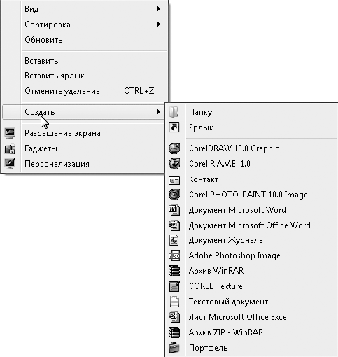Рис. 3.16. Перечень объектов, которые можно создать с помощью контекстного меню Рабочего стола