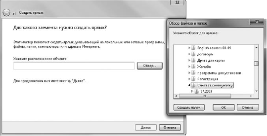 1. Щелкнуть на кнопке Обзор и указать в дереве папок объект, для которого необходимо создать ярлык (при этом путь к объекту будет выведен в текстовом поле).