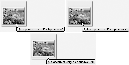 В Проводнике Windows 7 была значительно улучшена визуализация процесса перетаскивания объектов: крупные полупрозрачные эскизы, наличие подписи и значка рядом с указателем мыши явно отображают суть операции и не позволят вам ошибиться (рис. 3.18).