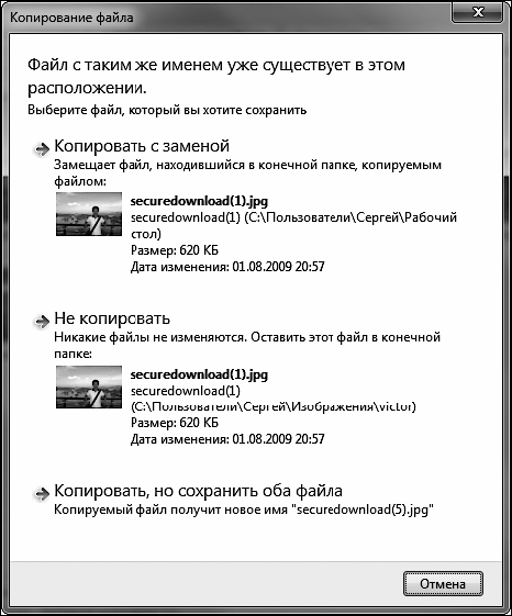 Рис. 3.19. Уведомление о совпадении имени копируемого файла с имеющимся в папке