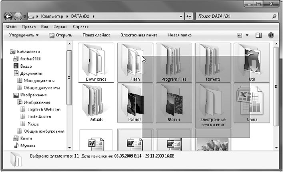 • Выделение группы файлов захватом мышью. Данный вариант выделения удобен в том случае, если объекты располагаются по соседству друг с другом. Щелкните на свободном участке рабочей области рядом с теми объектами, которые собираетесь выделить, и, удерживая нажатой левую кнопку мыши, захватите нужные значки полупрозрачным прямоугольником, перемещая мышь в их направлении (рис. 3.24).