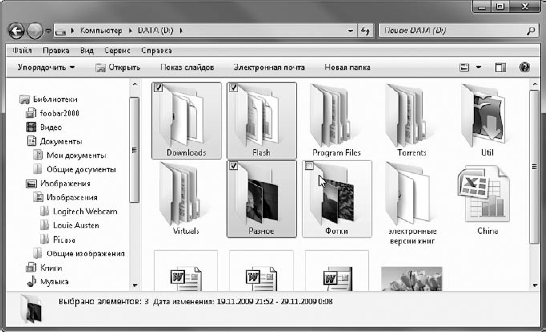 В Windows 7 появился новый прием выделения объектов без использования клавиатуры – при помощи флажков. Чтобы включить отображение флажков для значков в Проводнике, выполните команду Упорядочить ? Параметры папок и поиска, в открывшемся окне перейдите на вкладку Вид и установите флажок Использовать флажки для выбора элементов. После этого при наведении указателя мыши на любой значок в его верхней части будет появляться окошко флажка. Щелчком на нем вы можете установить флажок, выделив таким образом объект, а повторным щелчком снять выделение. Последовательно устанавливая флажки для разных объектов, вы можете выделить неограниченное их количество, не прибегая к удерживанию клавиш (рис. 3.25). Чтобы одновременно снять выделение флажками для нескольких объектов, просто щелкните на свободном участке области содержимого папки.