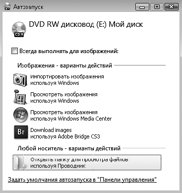 Если же на компакт-диске нет программы-оболочки (например, ее не будет на диске, который записал пользователь на своем компьютере), то при вставке CD в привод Windows анализирует его содержимое и открывает окно, в котором предлагается выбрать одно из действий в зависимости от типа файлов, обнаруженных на диске (рис. 3.29).