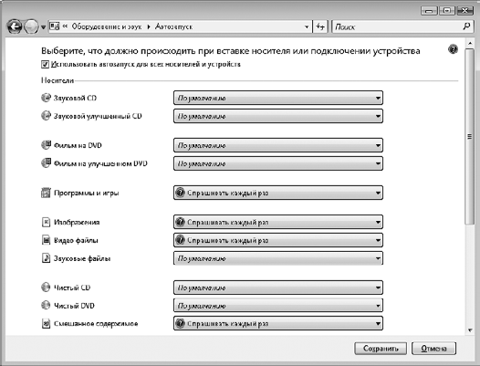 У вас есть возможность настроить автозапуск дисков с различным содержимым. В нижней части окна имеется ссылка Задать умолчания автозапуска в «Панели управления». Щелкнув на ней, вы откроете окно Автозапуск (рис. 3.30), в котором сможете включить использование автозапуска для любых сменных носителей, установив флажок в верхней части окна, а также выбрать в раскрывающихся списках действие, которое система должна выполнять по умолчанию, обнаружив определенное содержимое на том или ином диске.