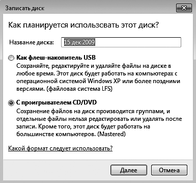 2. В окне подготовки диска введите его название, щелкните на ссылке Показать параметры форматирования, установите переключатель в положение С проигрывателем CD/DVD (рис. 3.31) и нажмите Далее.
