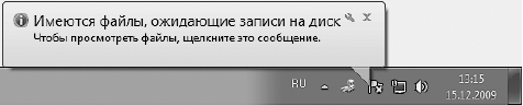3. Скопируйте в окно диска все необходимые файлы. После этого в области уведомлений появится сообщение о готовности файлов к записи (рис. 3.32). Щелкнув на нем, вы откроете окно CD-привода, в котором отображается образ диска – значки объектов для записи, помеченные стрелочкой.