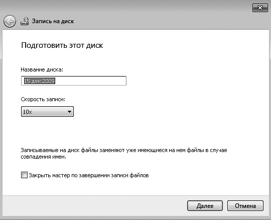 4. Нажмите на панели инструментов кнопку Записать на компакт-диск. При этом откроется окно записи (рис. 3.33). Наберите в нем название диска, установите скорость записи (в соответствии с возможностями вашего привода и маркировкой диска) и нажмите Далее для запуска процесса.