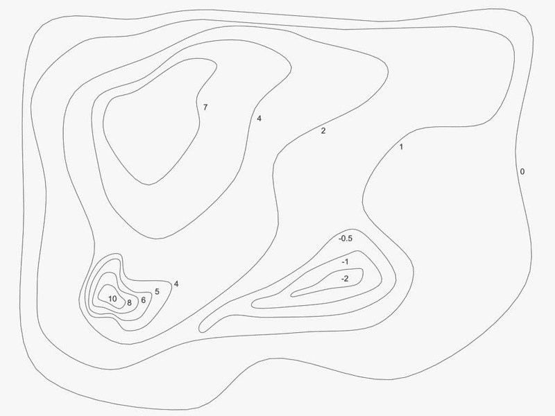 Итак, продолжим. Как видите, контуры с отрицательной высотой (углубления с отметками -0,5,-1,-2) остались нетронутыми – не можем же мы сделать цвет белее белого. А усложнять рисование, назначая нулевой отметке не чисто белый цвет, а градиент, не хочется: потом, рисуя сложный рельеф, можно запутаться. Проще это сделать уже по готовой сетке на уровне редактирования полигонов непосредственно в 3ds Max.