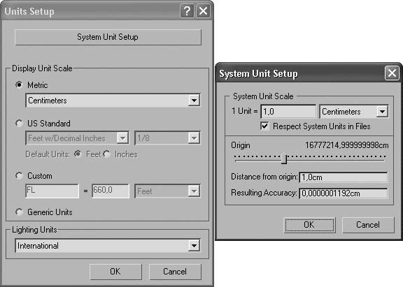 Выполните команду меню Customize ? Units Setup (Настройки ? Установка единиц). В окне Sistem Unit Setup (Установка системных единиц) выберите сантиметры (рис. 1.2). В этом масштабе будет сохраняться и экспортироваться сцена. В области Display Unit Scale (Отображение единиц масштаба) окна Units Setup (Установка единиц) также выставьте сантиметры. В сантиметрах будут отображаться все цифровые значения объектов в сцене.