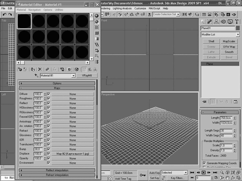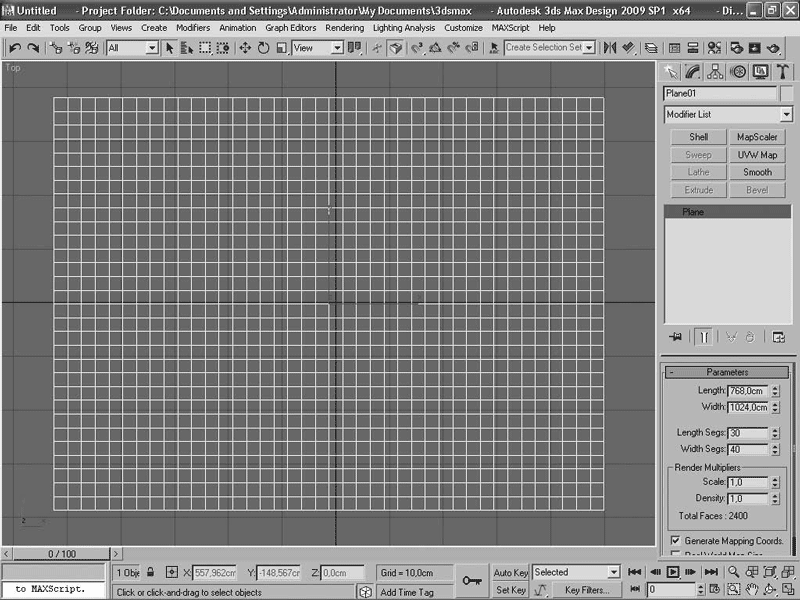Следующий этап – построение собственно самой сетки, из которой будет выдавливаться ландшафт. Необходимо соблюсти пропорциональность создаваемой сетки с имеющимся в нашем распоряжении чертежом. В данном случае это изображение 768 х 1024 пикселов. Значит, и сетка должна быть создана в тех же пропорциях.