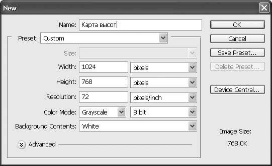 Создайте новый документ (рис. 1.4) размером 768 х 1024 пикселов; из вариантов Color Mode (Модель цвета) выберите Grayscale (Шкала яркости): создаваемое изображение нам необходимо в оттенках черного и белого, цвет нам совсем не нужен, и это позволит сделать карту менее требовательной к ресурсам компьютера.