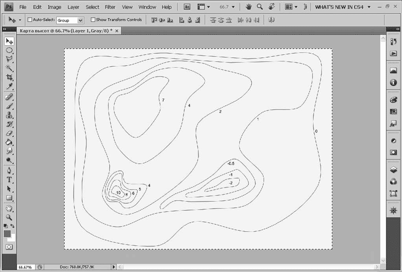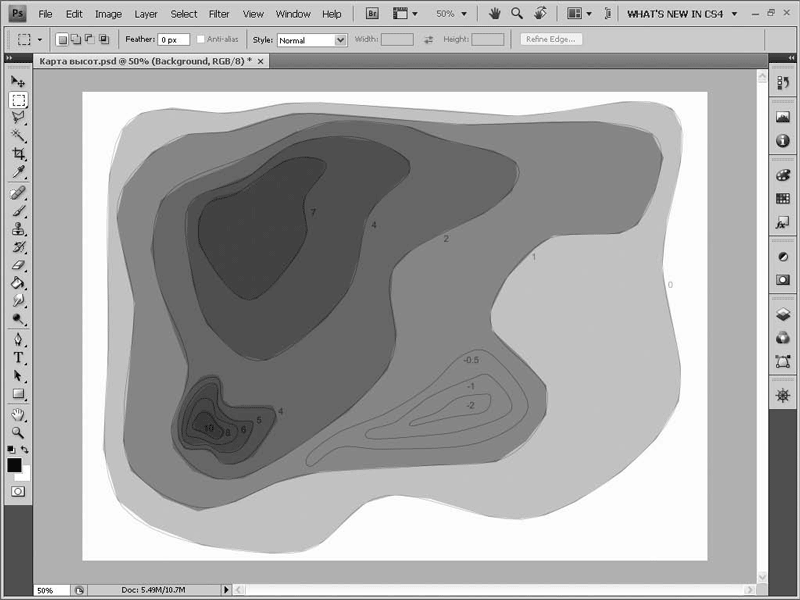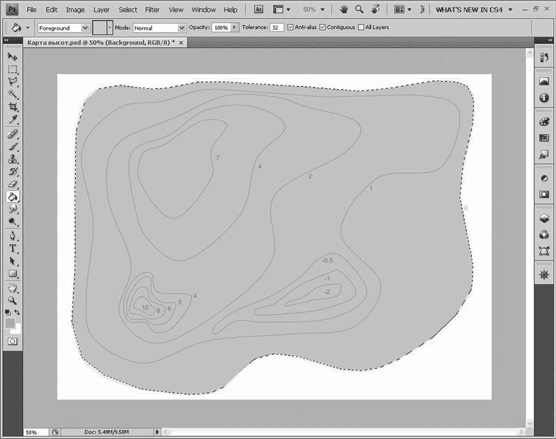 Как вы помните, чистый черный цвет – это нулевая отметка высоты. Белый – максимальная высота. Выберите инструмент Lasso (Лассо) (или любой другой удобный для вас инструмент) и обведите наружный контур кривой высот. Не старайтесь делать это очень точно: все равно потом придется применять размытие и ручную доработку кистью. Замкните выделение и залейте полученную область светло-серым цветом (RGB 190:190:190) (рис. 1.7).