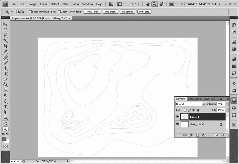 Скопируйте выделенное изображение в буфер обмена командой Edit ? Copy (Правка ? Копировать) или клавиатурной комбинацией Ctrl+C. Закройте без сохранения ненужный более документ и перейдите в изображение заготовки карты высот. Командой Edit ? Paste (Правка ? Вставить) наложите изображение из буфера обмена на чистый белый лист, на котором мы будем рисовать. Откройте палитру Layers (Слои) и уменьшите прозрачность слоя до 25 % (рис. 1.6).