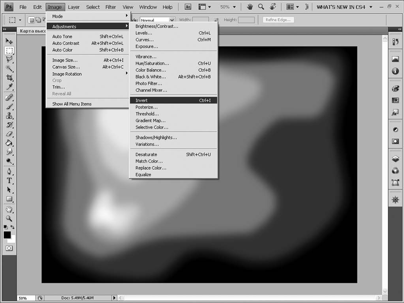 Теперь, когда рисунок карты высот практически готов, удалим слой с контурами: он больше не нужен, – и к основному слою применим фильтр размытия по Гауссу (из группы фильтров Blur (Размытие)) с небольшим значением – примерно 20 пикселов. Осталось только поменять местами значения черного и белого командой меню Image ? Adjustments ? Invert (Изображение ? Коррекция ? Инвертировать) (рис. 1.9).