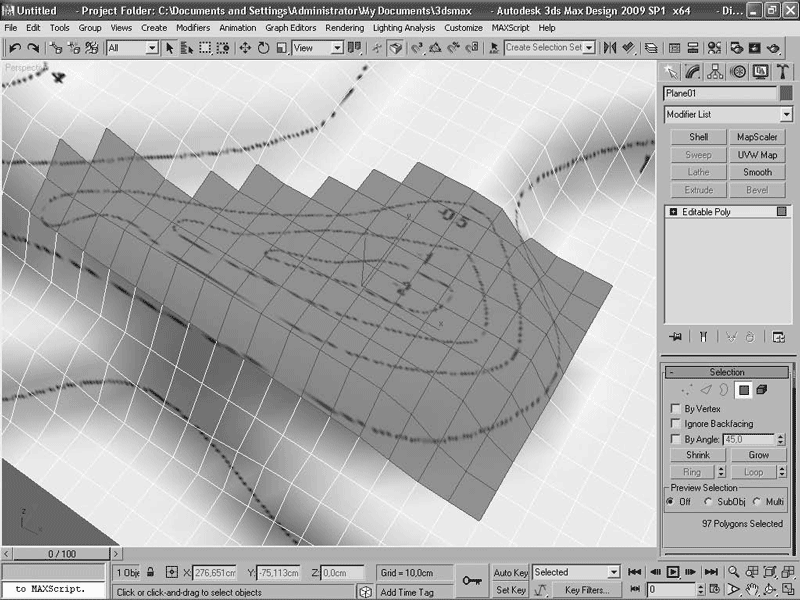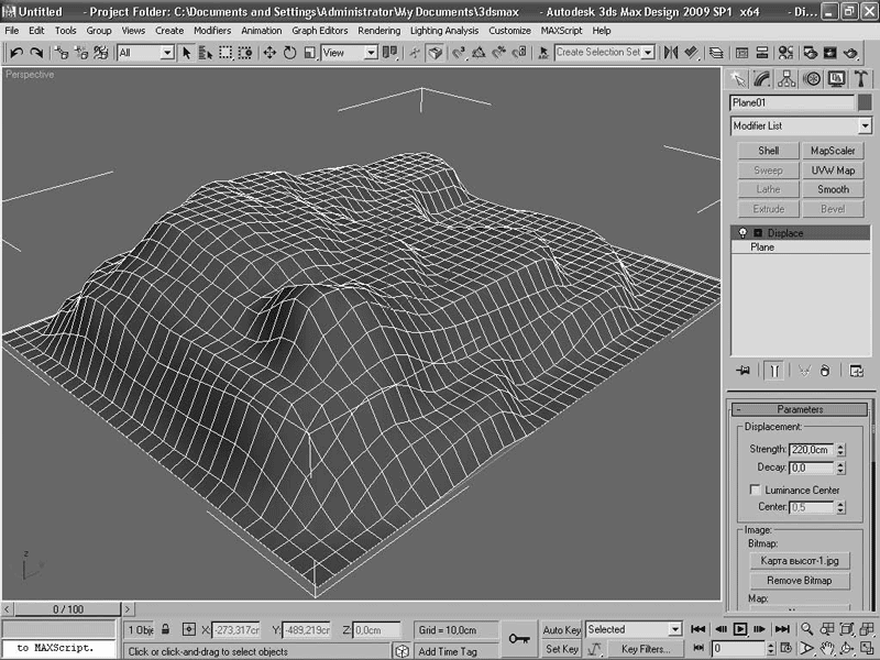Для параметра Strength (Сила выдавливания) из свитка Parameters (Параметры) модификатора Displace (Смещение) установите значение, соответствующее максимально высокой отметке согласно вашему чертежу. Нажав кнопку Bitmap (Растровая карта) модификатора, загрузите созданную карту высот.
