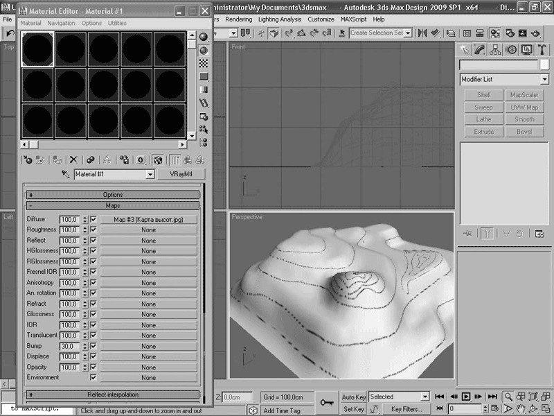 Откройте в редакторе материалов назначенный объекту материал и удалите из слота Displace (Смещение) назначенную ранее текстуру карты высоты. Это можно сделать, перенеся свободный слот с обозначением None (Нет) на слот смещения. В слот Diffuse (Основной цвет материала) добавьте карту с изображением изолиний. Теперь поверх объекта появилось изображение чертежа (рис. 1.13).