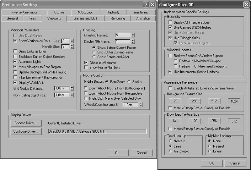 Чтобы чертеж отображался в окне просмотра с максимальным качеством, необходимо настроить некоторые параметры графического драйвера. Выполните команду меню Customize ? Preferences (Настройки ? Предпочтения), перейдите на вкладку Viewports (Окна проекций), нажмите кнопку Configure Drives (Конфигурация драйверов), в окне Configure Direct3D (Конфигурация Direct3D) установите значения согласно рис. 1.14 и перезапустите 3ds Max. Чертеж отобразится на экране с максимальным качеством, которое будет определяться качеством непосредственно самого чертежа.