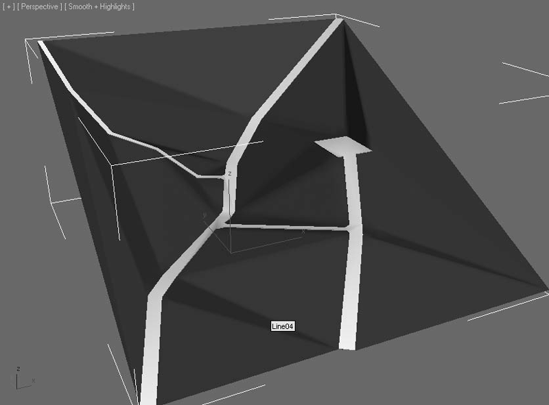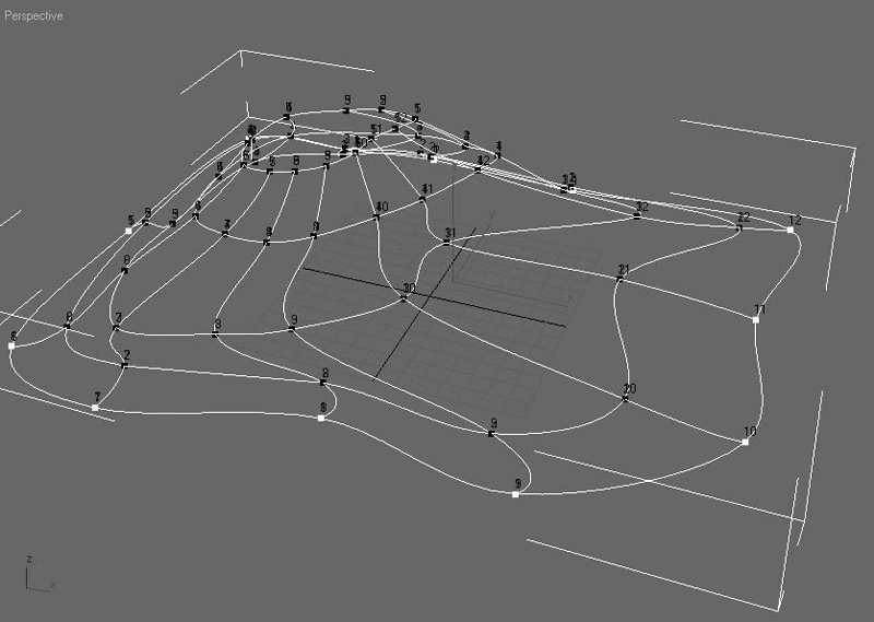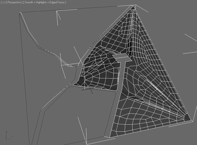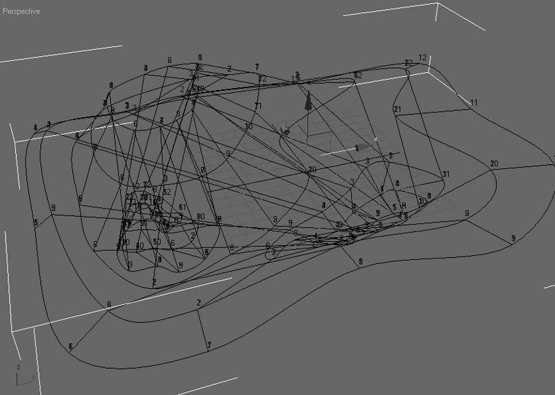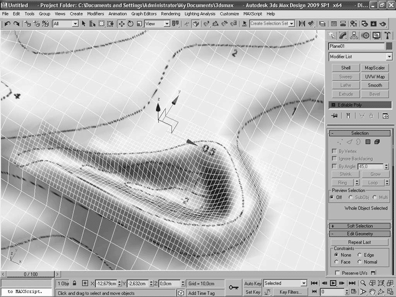 Основное преимущество этого способа построения в том, что форма создается действительно по изолиниям и в принципе довольно точно воспроизводит основной массив ландшафта. Безусловно, для этого есть специализированные программы, которые строят поверхность по изолиниям. Но при экспорте таких моделей в 3ds Max зачастую проявляются очень сложно решаемые проблемы с вывернутыми нормалями или слишком плотной и неоптимизируемой сеткой. Да и как показывает практика, визуализатору подобные чертежи приходят после двадцатого копирования, склеенные на коленке, и получить точные данные, чтобы задействовать подобные программы, чаще всего не представляется возможным. Поэтому и приходится моделировать поверхность с некоторой долей погрешности, на глазок.