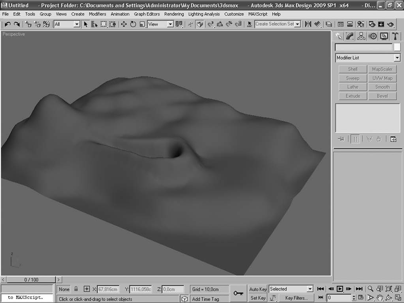 Задайте диаметр кисти в поле Brush Size (Размер кисти), степень воздействия в поле Brush Strenght (Сила нажима кисти) и, нажав кнопку Push/Pull (Вдавливание/вытягивание) с отрицательным значением в поле Push/Pull Value (Степень вдавливания/вытягивания), начинайте вдавливать контур водоема. Попеременно пользуясь выдавливанием и расслаблением, можно получить вполне неплохой результат (рис. 1.16). При определенном навыке моделирования инструмент дает безграничные возможности для легкого манипулирования формой объекта.