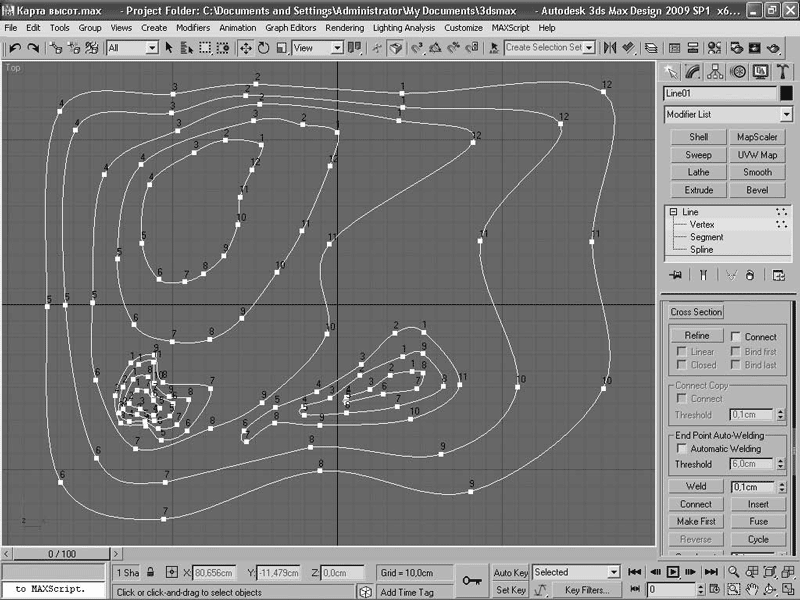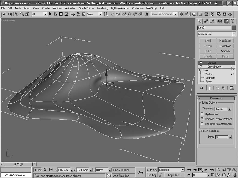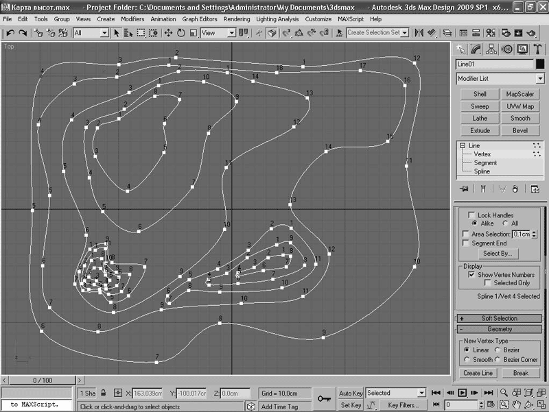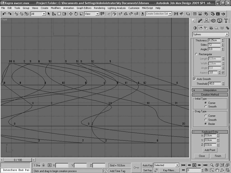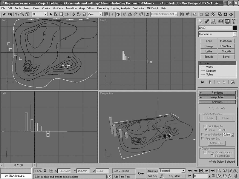 Запустите 3ds Max и создайте такой же объект-плоскость, какой мы делали при создании ландшафта первым способом, с теми же параметрами. Добавьте в слот Diffuse (Основной цвет материала) растровую карту высот и примените материал к объекту. Инструментом Line (Линия) (из группы Splines (Сплайны) раздела Shapes (Формы)) обведите контуры изолиний – получим сплайновую копию чертежа.