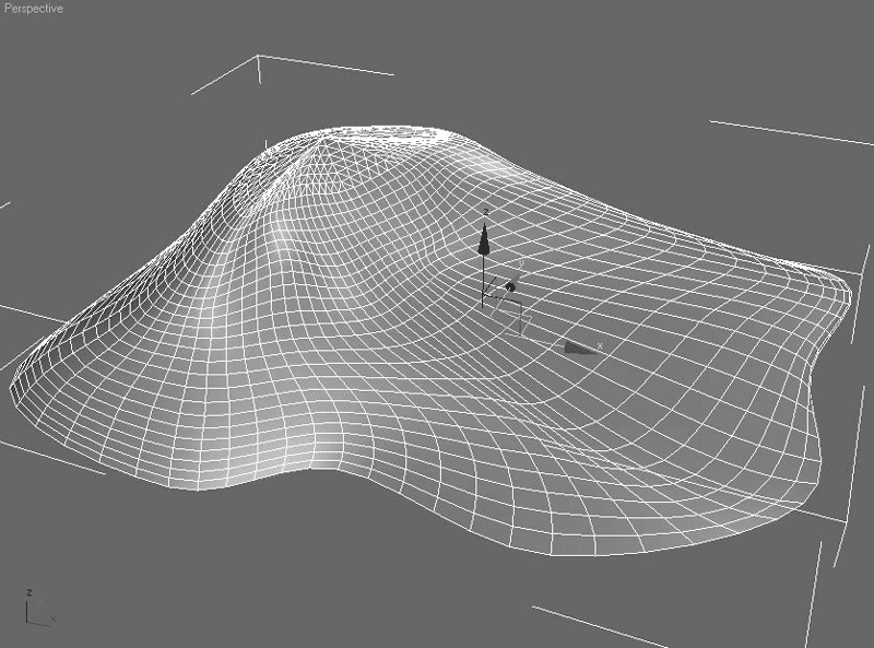 Безусловно, можно решить эту проблему длительной ручной доработкой и созданием опять-таки вручную линий-сечений инструментом Create Line (Создать линию). Но наша главная задача – свести затраченное на построение время к минимуму. Поэтому воспользуемся методами ранее описанного способа и некоторые части рельефа сформируем прямо на созданной сетке полигонов. Удалим сплайны, формирующие впадину и маленькую гору. После этого результат уже больше похож на требуемый (рис. 1.22).