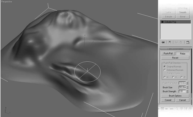Ну а теперь немного порисуем, воспользуясь свитком Paint Deformation (Преобразование рисованием) (он находится в самом низу свитков параметров). Здесь есть две кнопки: Push/Pull (Вдавливание/вытягивание) и Relax (Расслабление) – то есть, используя виртуальную кисть, можно выдавливать и разглаживать необходимые участки сетки, вводя положительные или отрицательные значения в поле Push/Pull Value (Степень вдавливания/вытягивания). Применив инструмент один раз, вы деформируете сетку на заданную в этом поле величину, применив повторно – повторите эффект с той же кратностью.