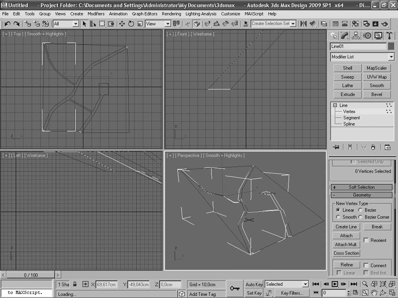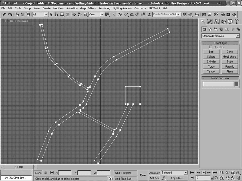 Все эти операции можно выполнять, не покидая окна проекции Top (Вид сверху), что достаточно удобно при работе с большим количеством цифровых значений и при необходимости постоянно сверяться с чертежами. Не нужно пытаться соединить части дорожного полотна одной непрерывной линией. Можно обойтись небольшими участками, которые потом замкнуть в единую форму. На замкнутость сплайновой формы и пропущенные при создании вершины следует обратить особое внимание. В противном случае могут возникнуть дыры в местах сопряжения с дорожным полотном или невозможность создания видимой поверхности у разомкнутой формы.