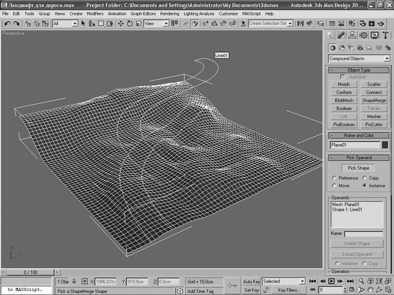 Расположите форму над поверхностью ландшафта и выберите в списке разновидностей объектов раздел Compound Objects (Составные объекты). Это набор инструментов, которые позволяют получить трехмерную форму при взаимодействии между собой нескольких объектов, например при вырезании (ProBooleans (Улучшенные булевские объекты)), размножении объектов по поверхности (Scatter (Распределение)) или проецировании на поверхность другого объекта (Shape Merge (Слияние формы)). Последнюю операцию мы и используем. Выделите объект-ландшафт и активизируйте инструмент Shape Merge (Слияние формы). Нажмите кнопку Pick Shape (Указать форму) и укажите на сплайновую форму дороги (рис. 2.3).