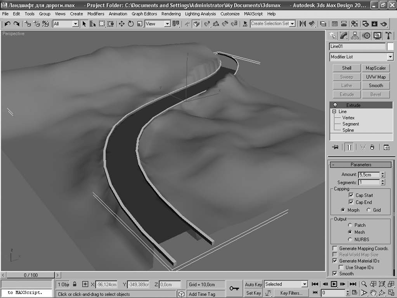 Примените к сплайновой форме модификатор Extrude (Выдавливание), чтобы форма немного приподнялась над ландшафтом. По описанной выше технологии используйте оставшуюся сплайновую форму для создания бордюра. В итоге у вас должна получиться сцена (рис. 2.9), аналогичная сцене Готовый ландшафт с дорогой. тах на диске. Теперь ландшафт, дорога и бордюр – самостоятельные объекты, что в дальнейшем облегчит их возможное модифицирование, а также текстурирование.