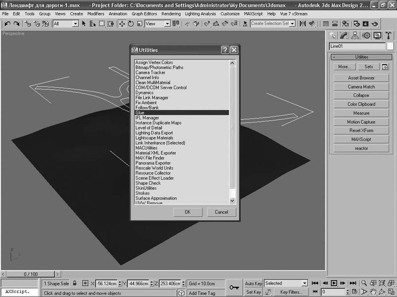 Выделите сплайновую форму, обозначающую дорогу, и перейдите на вкладку Utilites (Утилиты) командной панели. Нажмите кнопку More (Больше) и выберите в списке появившегося окна строку Glue (рис. 2.7). (Инсталляция подключаемого модуля подробно описана в идущей с ним документации.) Нажмите кнопку OK.