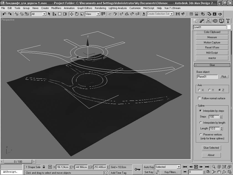 Если ландшафт не сильно пересеченный и нет необходимости строить насыпи, да и вообще, если модель дороги нужно создать отдельным объектом, независимым от модели ландшафта, то можно воспользоваться инструментом Glue. Этот инструмент не входит в комплект 3ds Max, а является дополнительным подключаемым модулем.