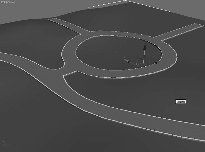 Откройте из диска сцену Ландшафт для дороги-1.max. Сцена состоит из слегка холмистого ландшафта и небольшой транспортной развязки (рис. 2.6).