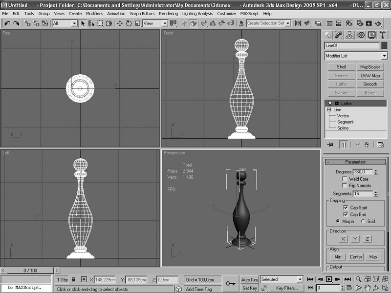 Возьмем для примера такую часто встречающуюся деталь, как балясина. Постройте достаточно простую форму, отдаленно напоминающую балясину, самым распространенным методом – методом вращения сплайна модификатором Lathe (Вращение) с параметрами по умолчанию. Нажмите на клавиатуре клавишу 7 – выведется информация о количестве полигонов и вершин созданной модели. В нашем случае это 2944 полигона (рис. 2.11).