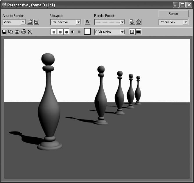 Созданная и измененная копия имеет всего 584 полигона. Это тоже достаточно много. Да и вообще, способ создания объекта модификатором Lathe (Вращение) экономным не назовешь. Но сейчас речь о другом. Давайте отодвинем эту облегченную модель на средний и дальний план и визуализируем сцену. Как видите (рис. 2.13), модель с высокой детализацией и облегченная четырехгранная модель выглядят практически идентично.