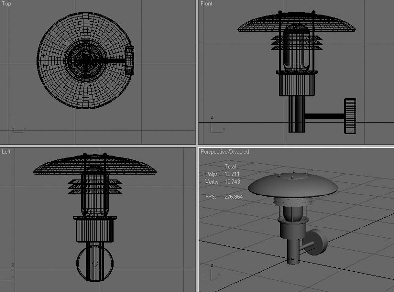 Давайте проследим процесс минимизации на конкретном примере. Возьмем лампу наружного освещения из известной коллекции Archmodels 22. По умолчанию она состоит из 10 711 полигонов (рис. 2.14), хотя и смоделирована на первый взгляд тщательно и грамотно.