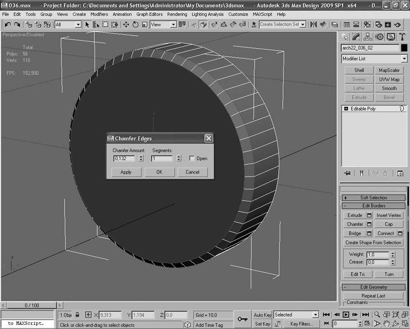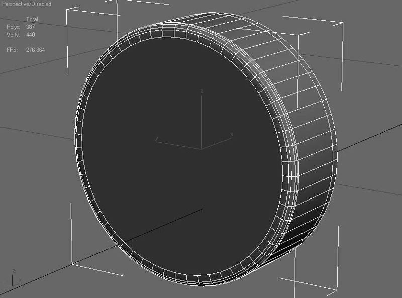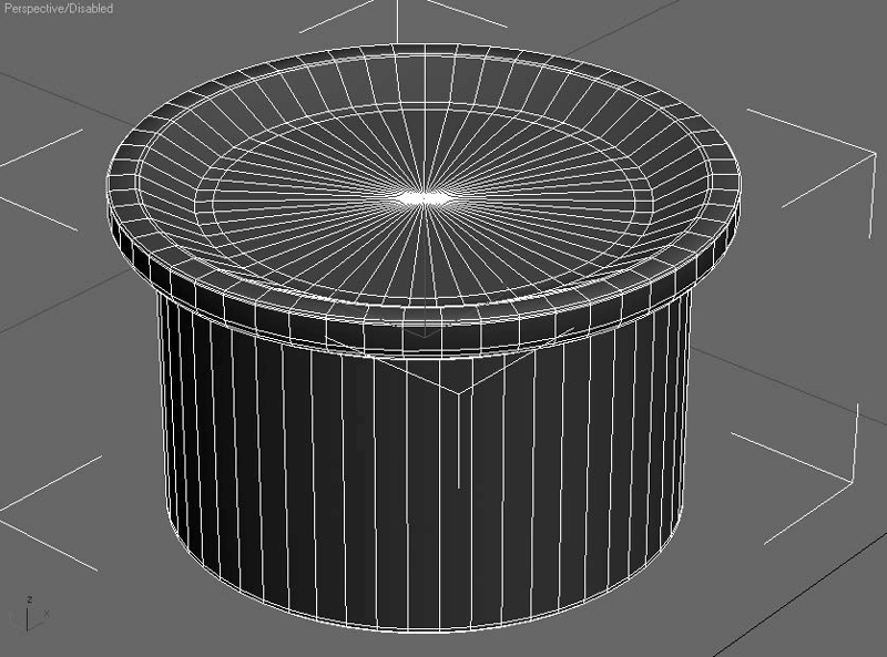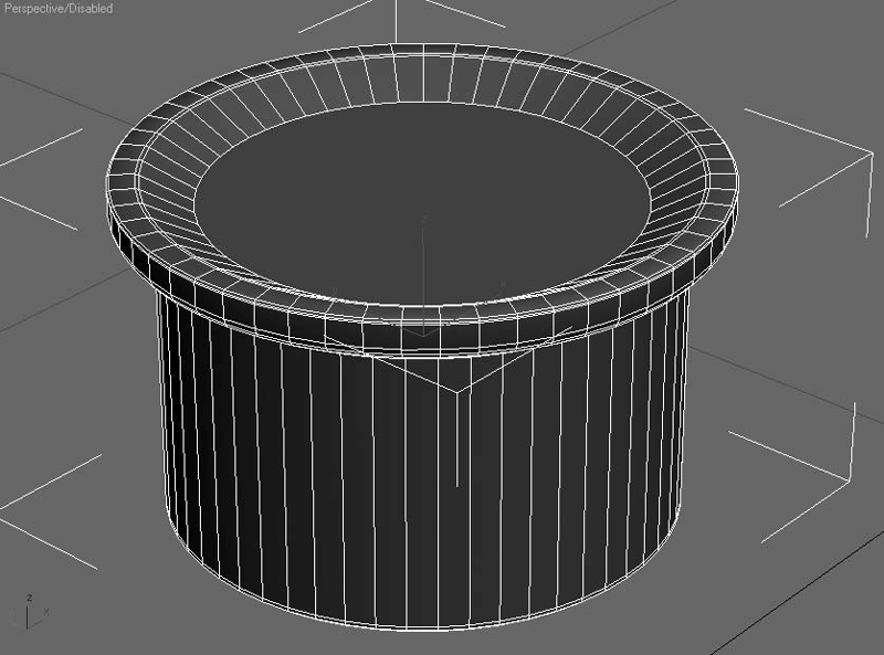 Удалите лишние полигоны и создайте более простую фаску инструментом полигонального моделирования Chamfer (Срез). Количество полигонов уменьшилось в семь раз по сравнению с исходной формой (рис. 2.16). А на том расстоянии, на котором будет рассматриваться этот светильник, просто невозможно разглядеть упрощенную фаску.