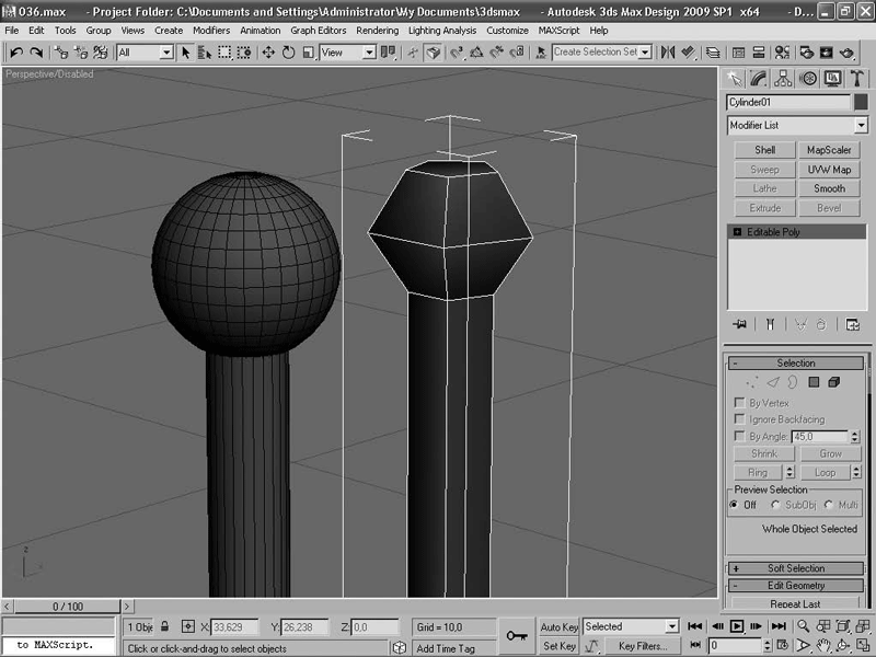 Вроде бы мелочи, но как говорится, «жизнь – цепь, а мелочи в ней – звенья, нельзя звену не придавать значения». Из таких маленьких огрехов набегают большие ошибки, многократно умноженные при создании гиперсцен. А именно их вы и учитесь создавать быстро и бесфорсмажорно. Давайте упростим эту деталь в свете наших правил. Вернее, создадим новую: так будет проще – из цилиндра с пятью гранями и небольшого навершия с помощью инструмента Bevel (Фаска) из набора инструментов полигонального моделирования (рис. 2.19).