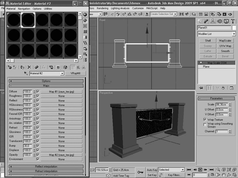 Ну и напоследок немного про заборы и ограды. Ни один дом или коттедж не обходится без этих элементов. Глухую кирпичную или бутовую стену смоделировать не представляет труда. А если речь идет о хитросплетении кованых деталей или сетке-рабице? Тут метод полигонального моделирования будет слишком емкий по требуемым ресурсам. Попробуем сделать это проще – текстурой с прозрачностью. Откройте 3ds Max и в новом документе создайте простую сценку, как показано на рис. 2.22. Центральный элемент сделайте примитивом Plane (Плоскость).