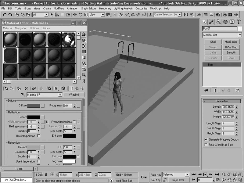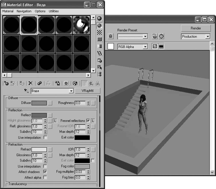 Материал воды VRayMtl (Материал V-Ray) применен к объекту-прямоугольнику (не к плоскости), который обязательно должен немного пересекаться с объектом-бассейном. Измените цвет материала на светло-голубой с помощью цветового поля Diffuse (Основной цвет материала) в одноименной области, а в поле Refract (Преломлять) из области Refraction (Преломление) задайте светло-серый цвет (рис. 2.26).